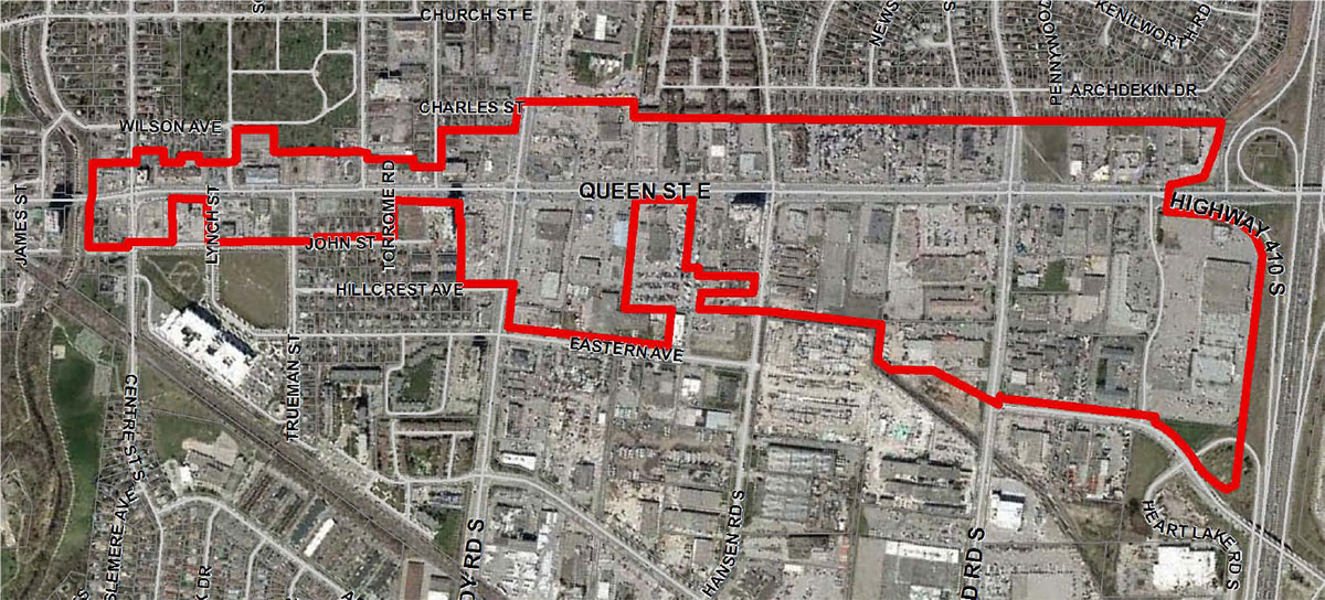 The Queen Street Corridor Land Use Study is located within the Queen Street Corridor Secondary Plan (Area 36), more specifically it includes the properties along Queen Street East between Etobicoke Creek and Highway 410.