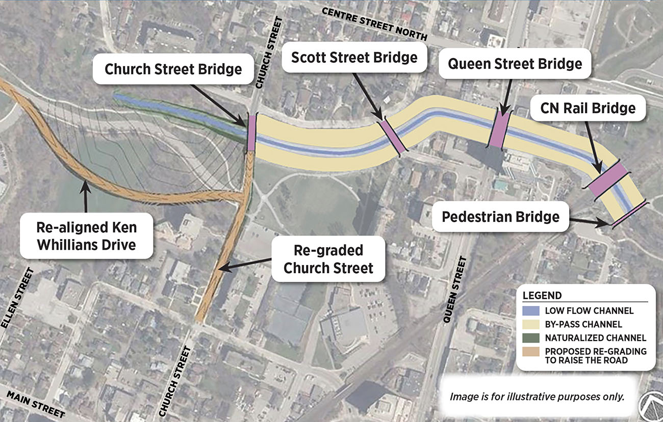 Downtown Brampton Flood Protection (DBFP) project, is part of Riverwalk and focuses on ways to eliminate and reduce flooding from the Etobicoke Creek during extreme storms. This project will make improvements to the Etobicoke Creek channel, as per the approved DBFP Environmental Assessment (2020), including: